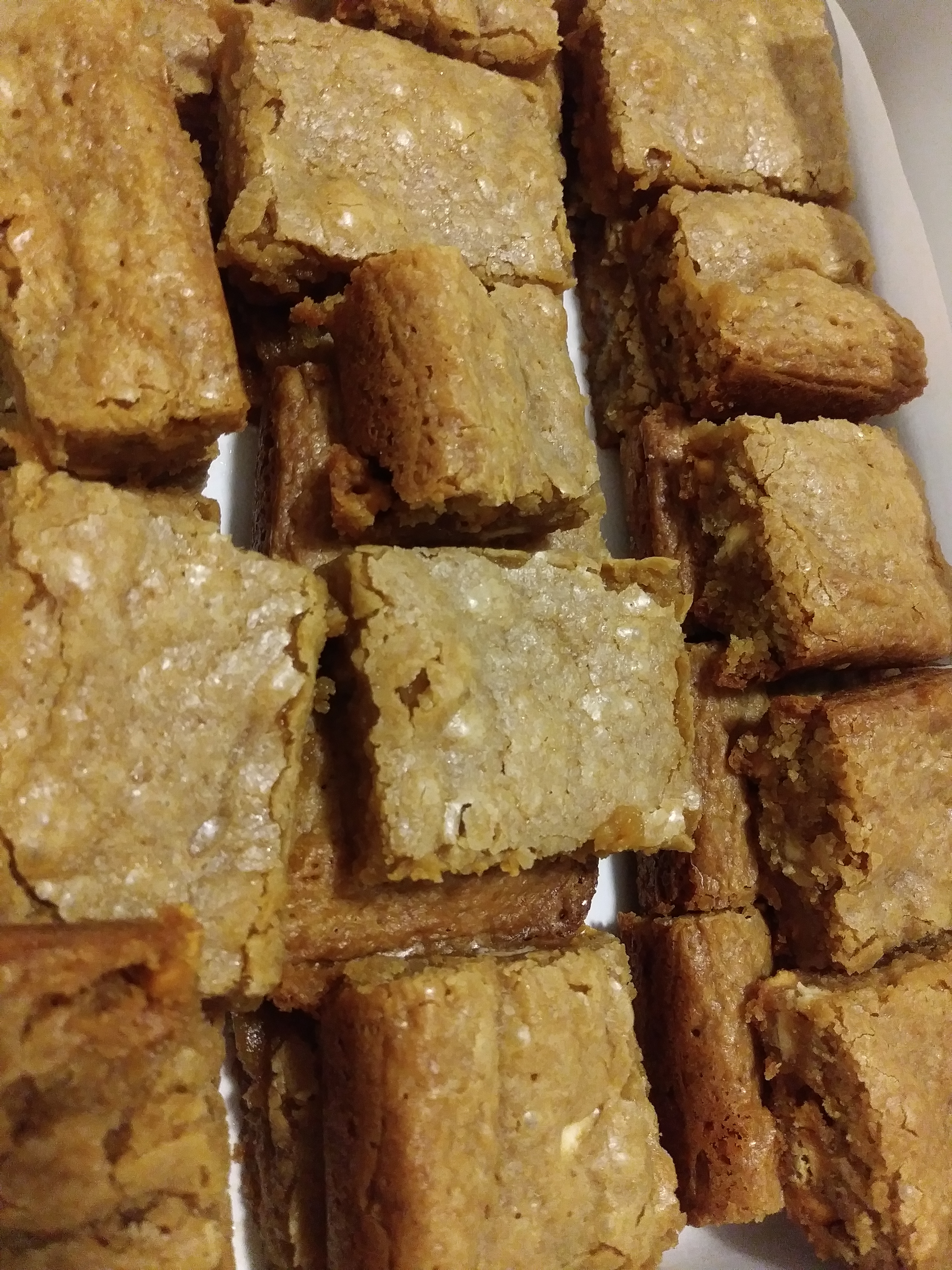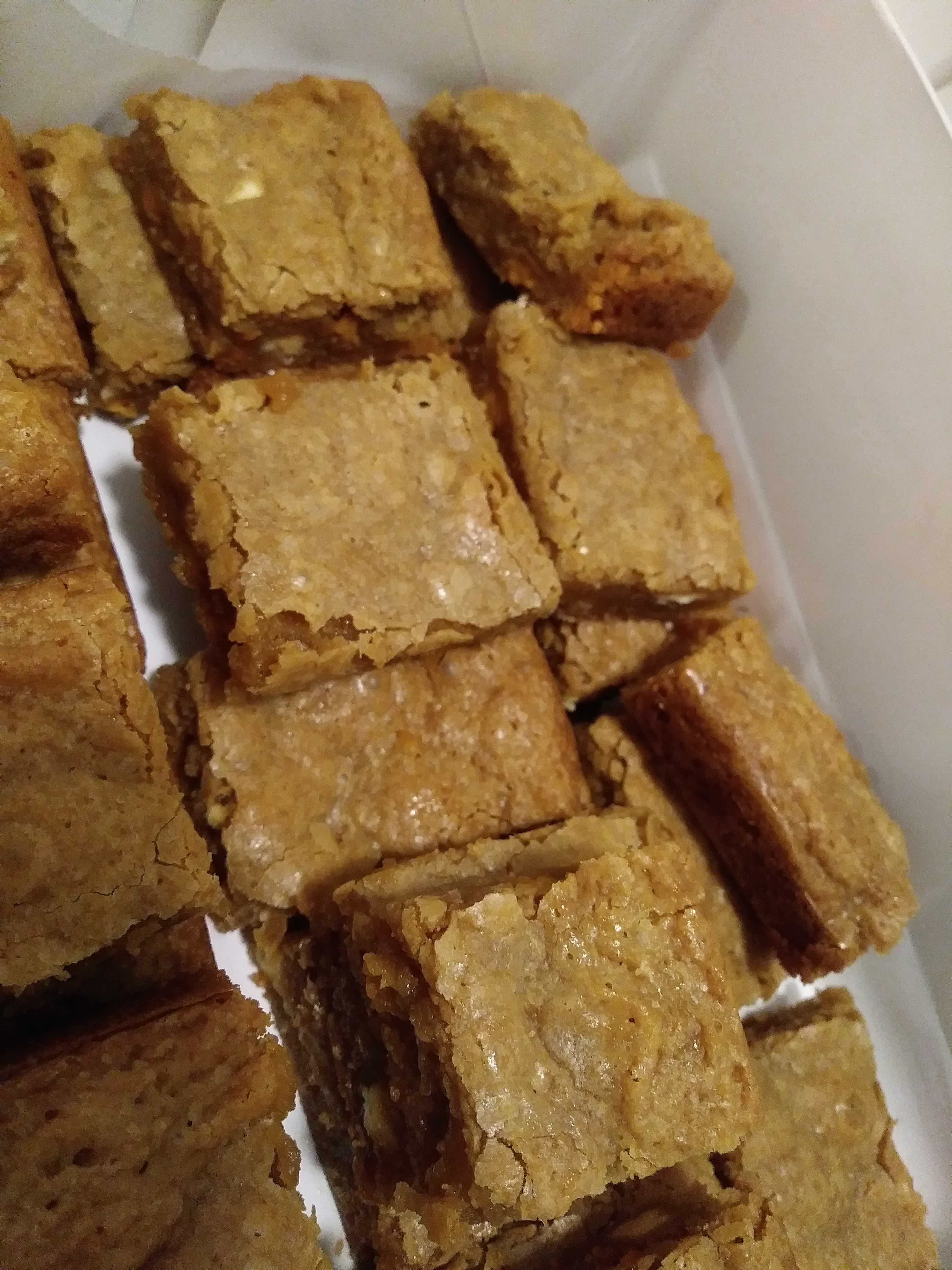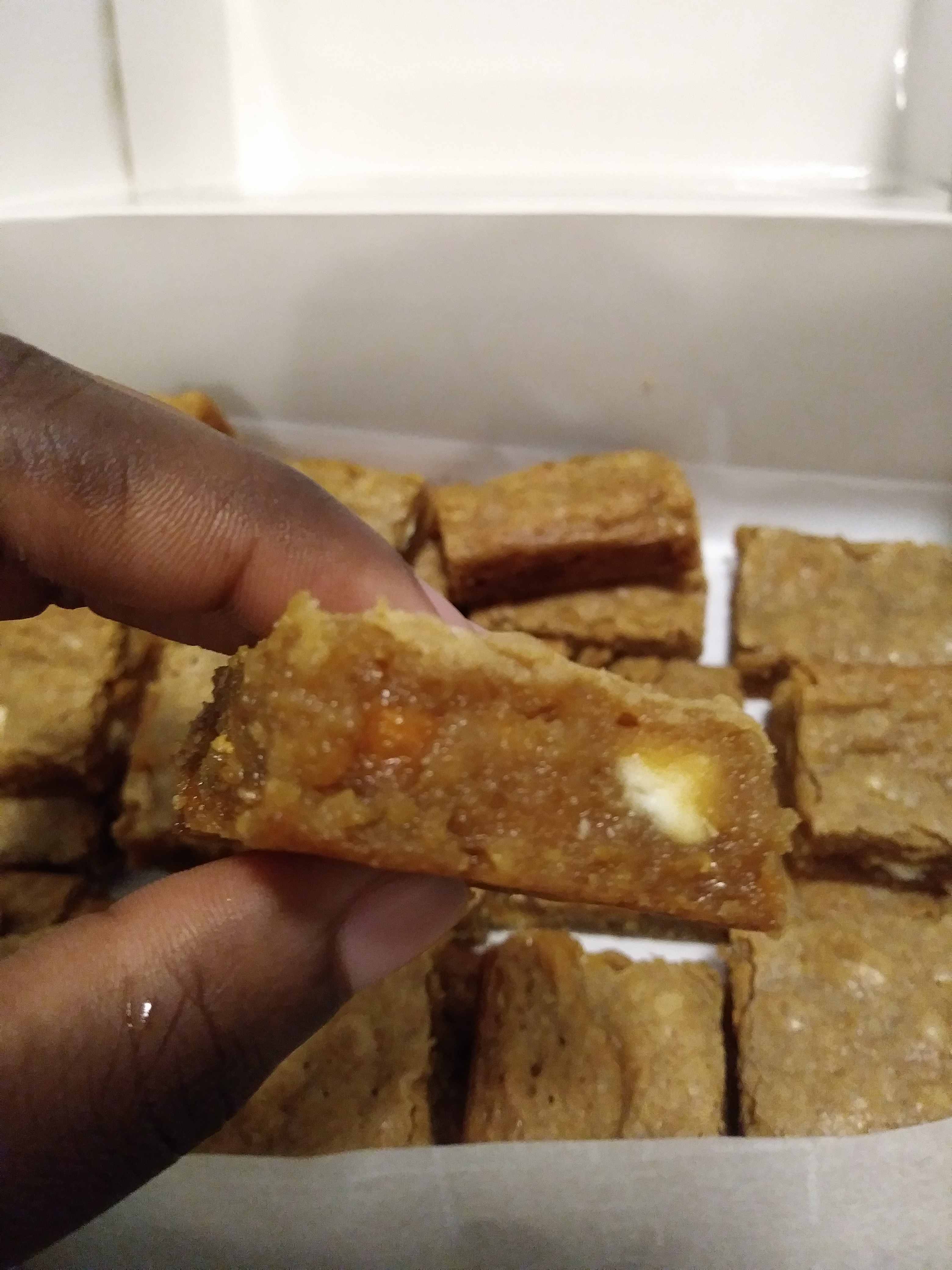 I’m so bad at following recipes and sometimes it bites me the butt, but thankfully this wasn’t one of those times. The original recipe for Knock You Naked Blondies called for all light brown sugar and butterscotch chips only. I enjoy the rich taste of dark brown sugar, plus I had both on hand so I used 3/4 cups of dark brown sugar along with 1 cup of light brown sugar. The addition of the dark brown sugar added a next level richness to the blondies. I also tossed in a bunch of white chocolate chips because I happened to have them on hand. I would 100% make these again, but I might brown the butter first. Can’t wait!